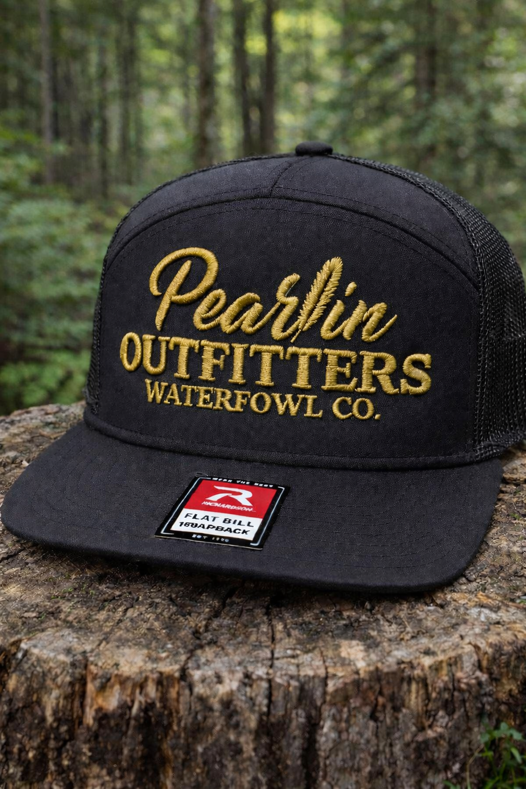 Built for the field and styled for everyday wear, the Pearlin Outfitters Waterfowl Co. hat delivers premium quality with a timeless outdoors look. This Richardson 168 features a structured black crown paired with a flat bill for a modern, clean fit.